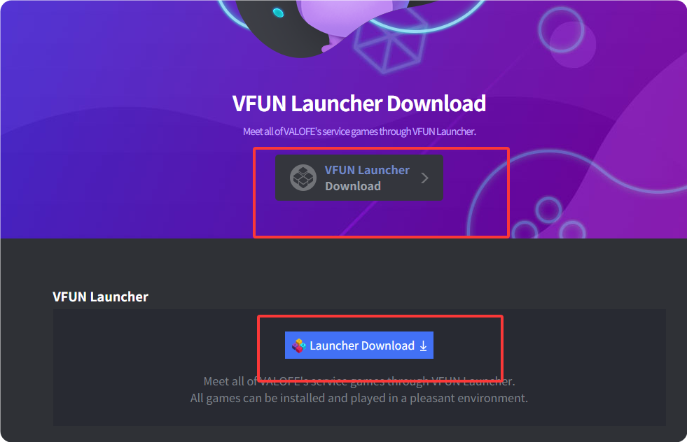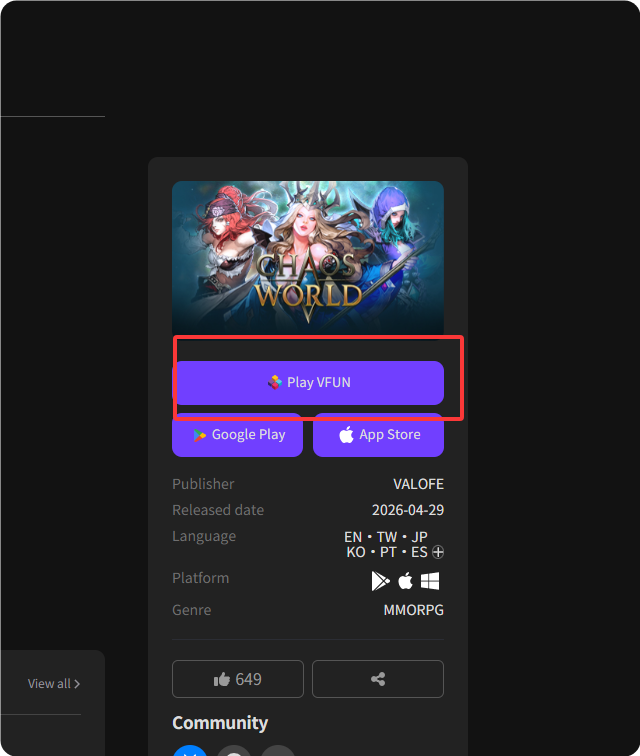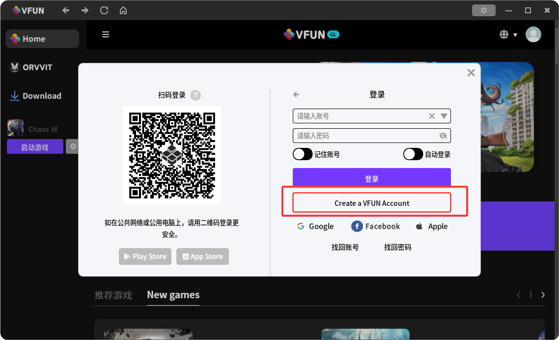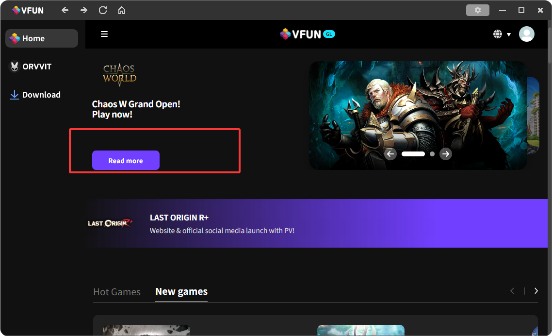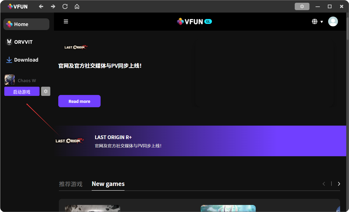 进入混沌W官网后,点击右侧的“Play VFUN”进入下载页面;